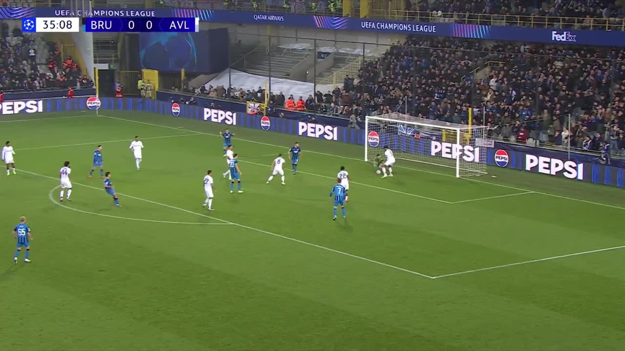 Tiro atajado raso al centro del arco. Ardon Jashari (Club Brugge) zurdazo desde fuera del área.