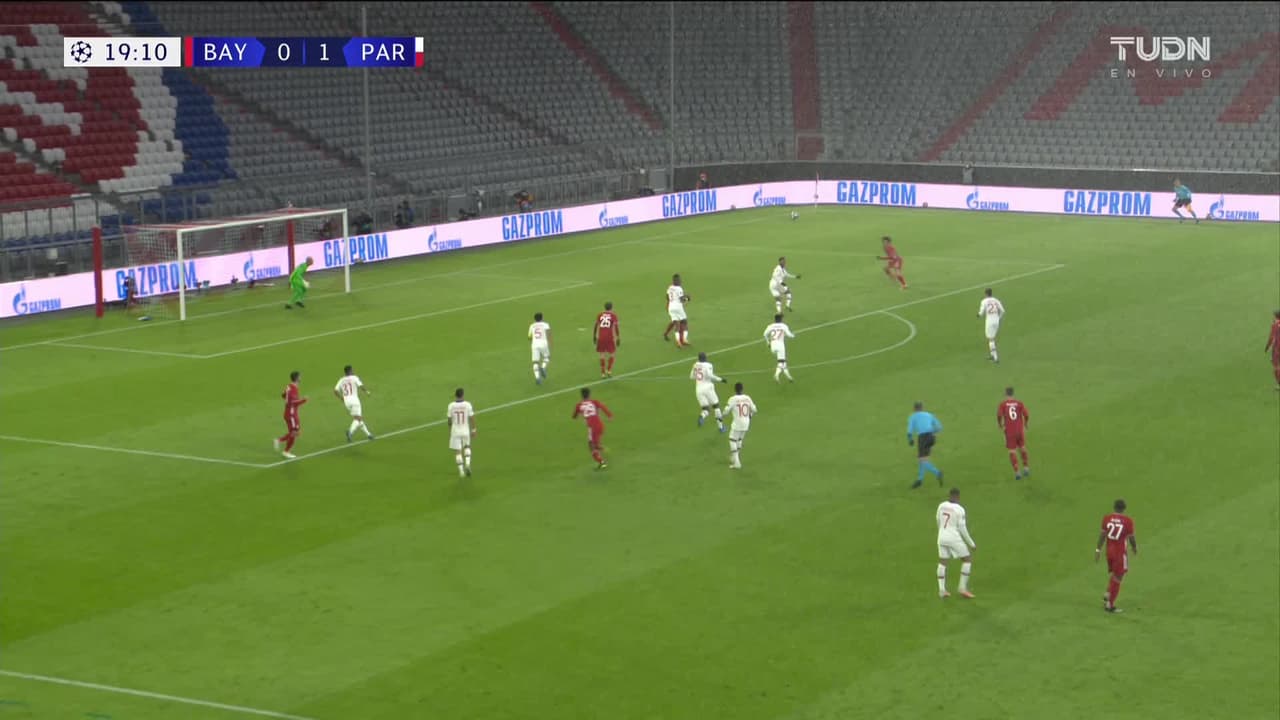 Tiro atajado junto al lado derecho de la portería. Benjamin Pavard (FC Bayern München) Disparo con la derecha desde el lado derecho dentro del área. Asistencia de Leroy Sané.
