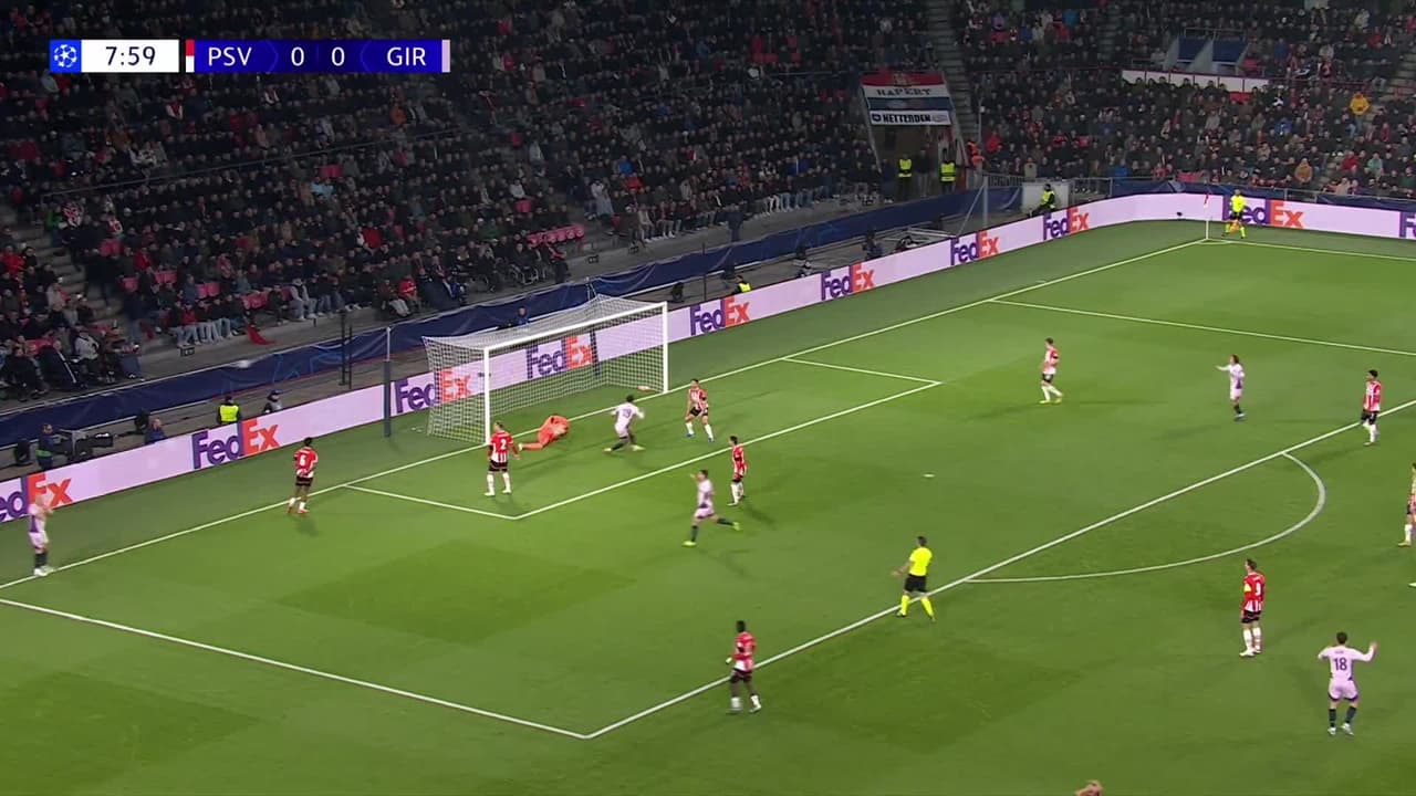 Tiro atajado Por arriba en el centro del arco. Bojan Miovski (Girona) zurdazo a quemarropa desde el lado izquierdo. Asistencia de Donny van de Beek.