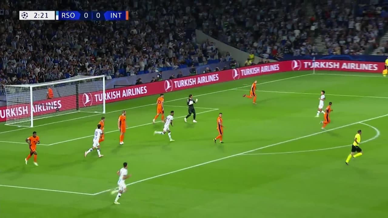 Tiro atajado Por arriba en el centro del arco. Brais Méndez (Real Sociedad) disparo de cabeza desde el centro del área. Asistencia de Ander Barrenetxea con un centro al área.