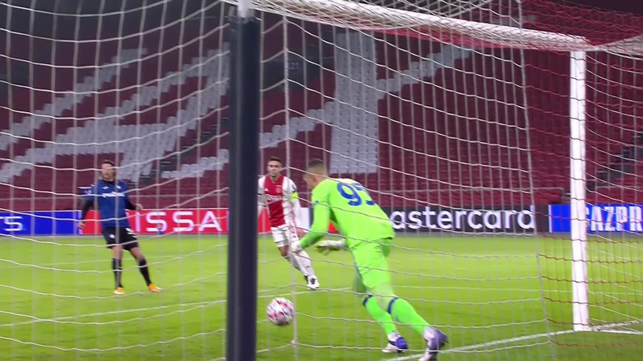 Tiro atajado raso al centro del arco. Brian Brobbey (Ajax) disparo de cabeza desde el centro del área. Asistencia de Antony con un centro al área.