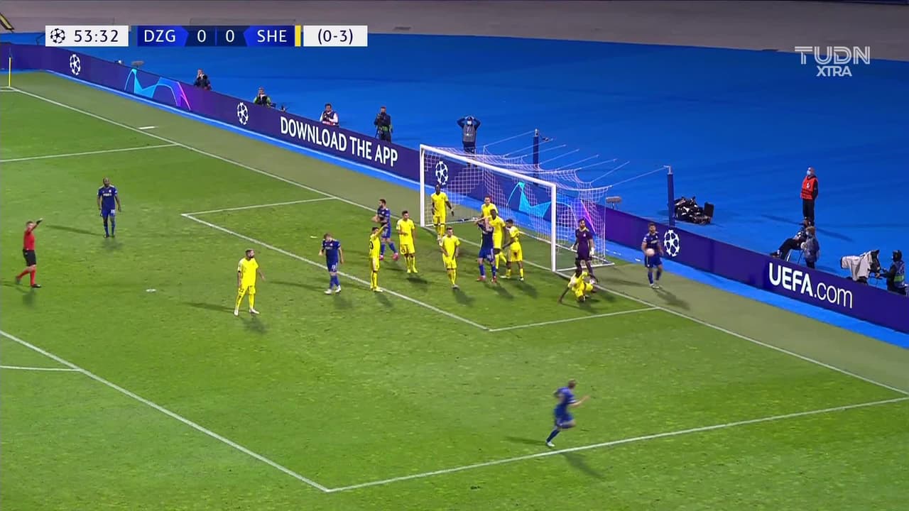 Tiro atajado junto al lado derecho de la portería. Bruno Petkovic (Dinamo Zagreb) Disparo con la derecha a quemarropa desde el lado derecho.