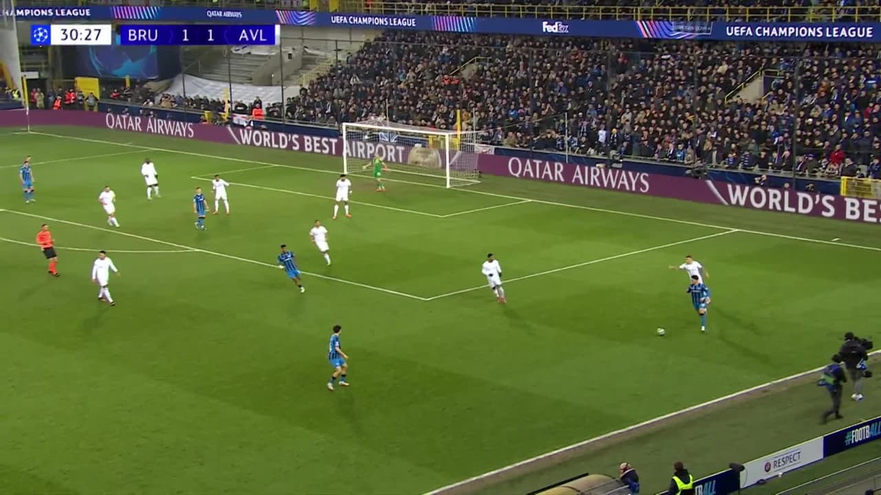 Tiro atajado por abajo a la izquierda. Chemsdine Talbi (Club Brugge) Disparo con la derecha desde el lado derecho dentro del área.