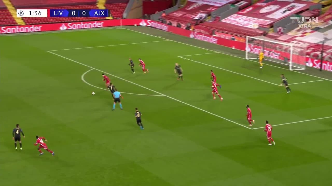 Tiro atajado. Curtis Jones (Liverpool) zurdazo desde fuera del área.