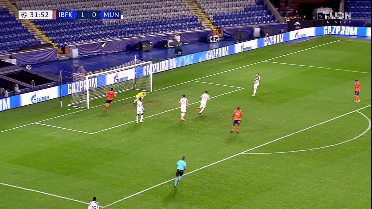 Tiro atajado raso al centro del arco. Danijel Aleksic (Istanbul Basaksehir) disparo de cabeza desde el centro del área. Asistencia de Boli Bolingoli-Mbombo con un centro al área.
