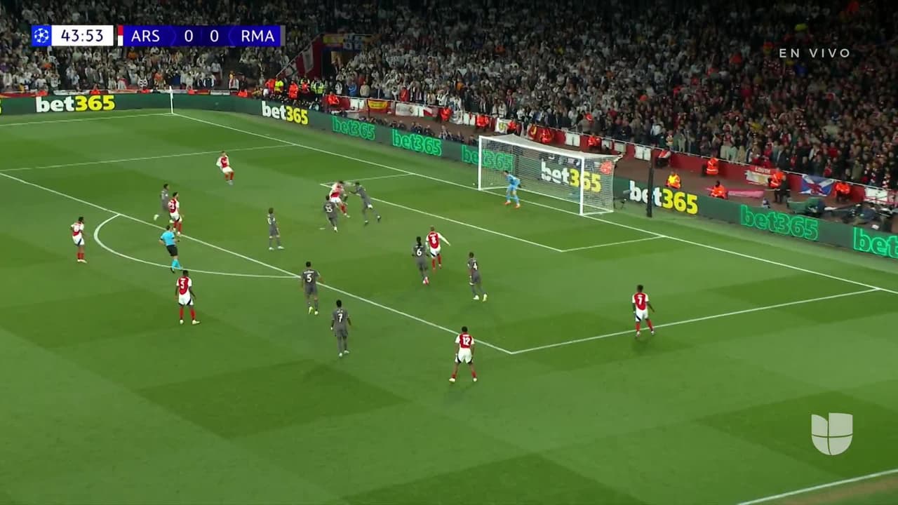 Tiro atajado por abajo a la izquierda. Declan Rice (Arsenal) disparo de cabeza desde el centro del área. Asistencia de Jurriën Timber con un centro al área.