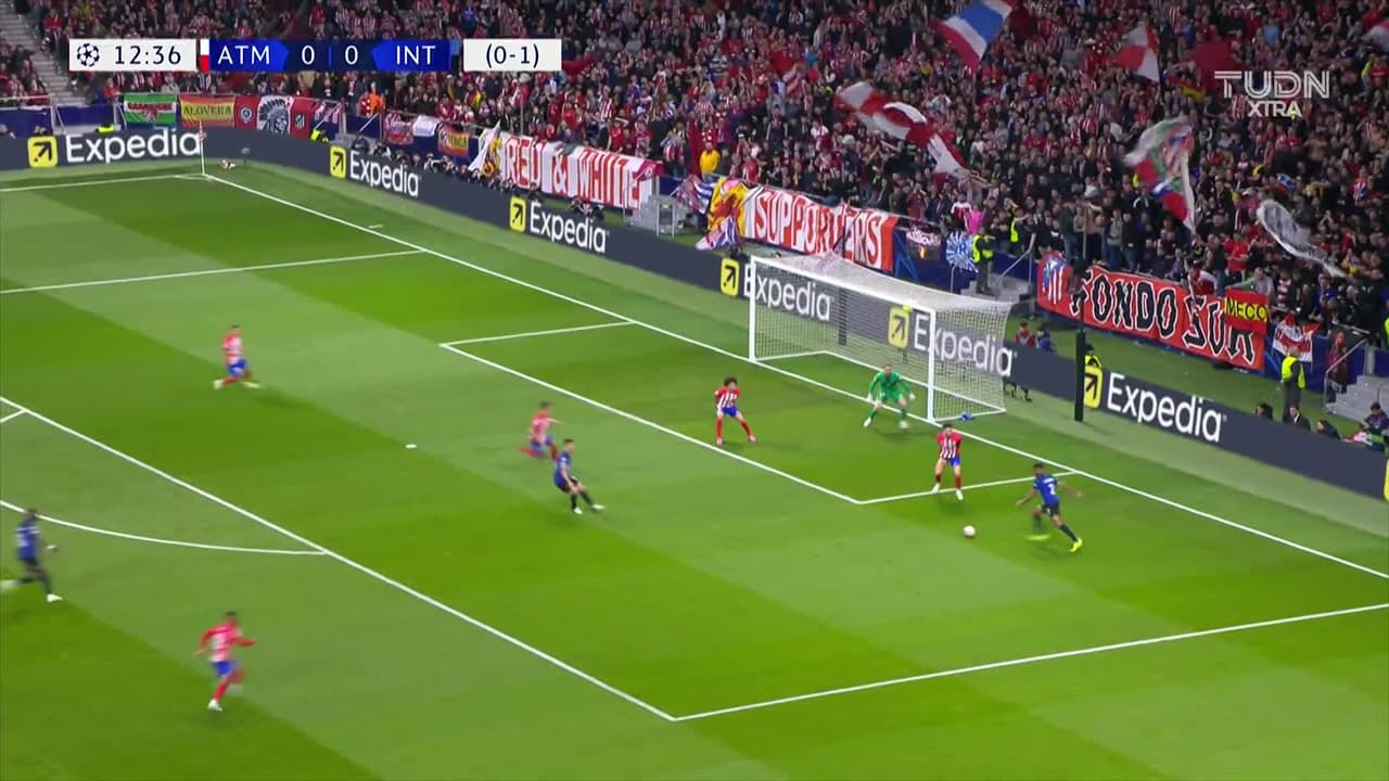 Tiro atajado junto al lado derecho de la portería. Denzel Dumfries (Internazionale) zurdazo desde el lado derecho dentro del área.