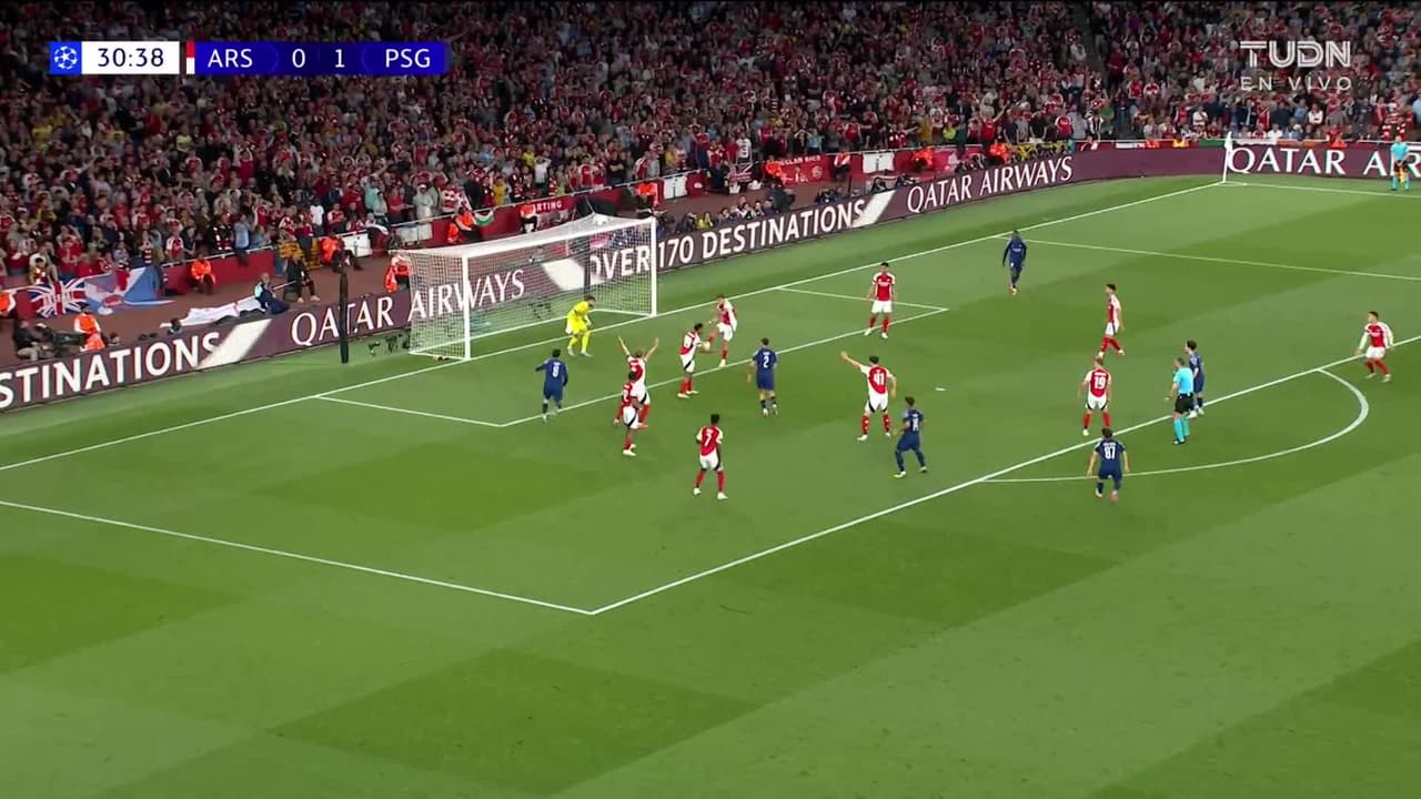 Tiro atajado por abajo a la izquierda. Désiré Doué (Paris Saint-Germain) Disparo con la derecha desde el centro del área.