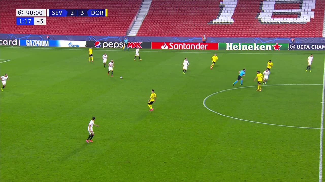 Tiro atajado. Diego Carlos (Sevilla) Disparo con la derecha desde el centro del área.