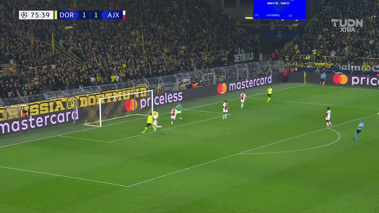 Tiro atajado por abajo a la izquierda. Donyell Malen (Borussia Dortmund) Disparo con la derecha desde el lado derecho dentro del área.