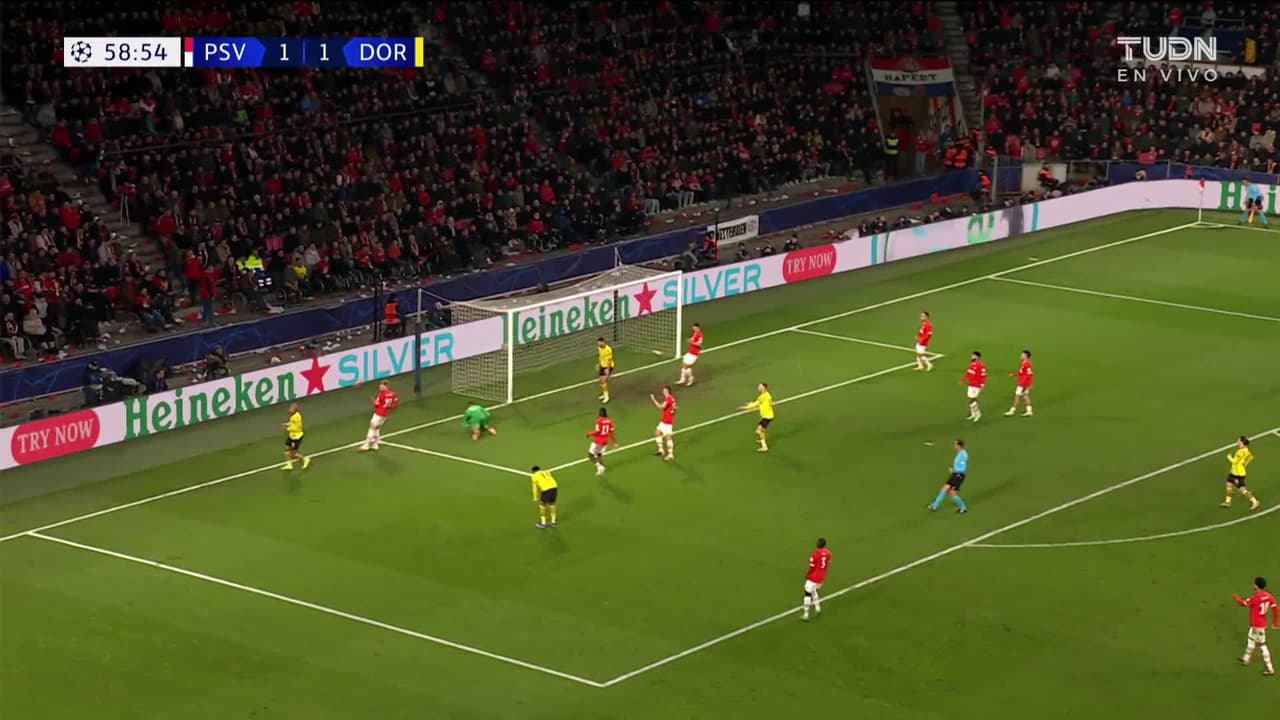 Tiro atajado raso al centro del arco. Donyell Malen (Borussia Dortmund) Disparo con la derecha sin ángulo desde la izquierda. Asistencia de Julian Ryerson.