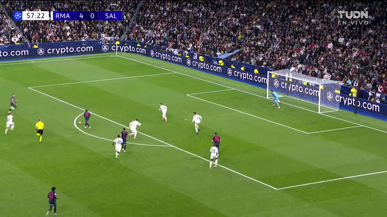 Tiro atajado. Dorgeles Nene (FC Red Bull Salzburg) zurdazo desde fuera del área.