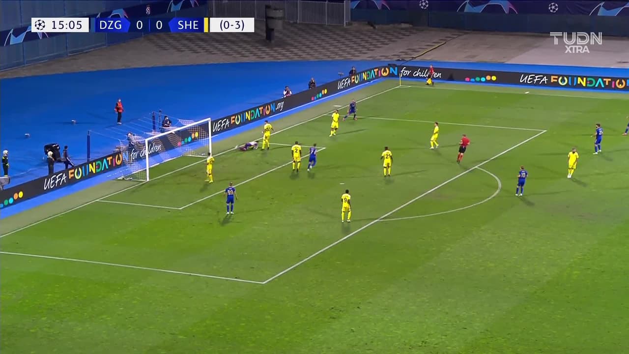 Tiro atajado junto al lado derecho de la portería. Duje Cop (Dinamo Zagreb) Disparo con la derecha desde el lado derecho dentro del área. Asistencia de Bruno Petkovic.
