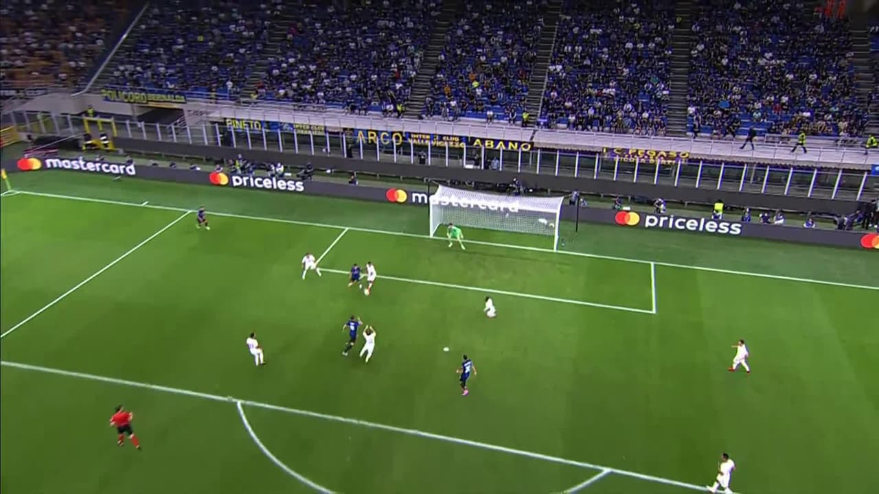 Tiro atajado raso al centro del arco. Edin Dzeko (Internazionale) Disparo con la derecha desde el centro del área.
