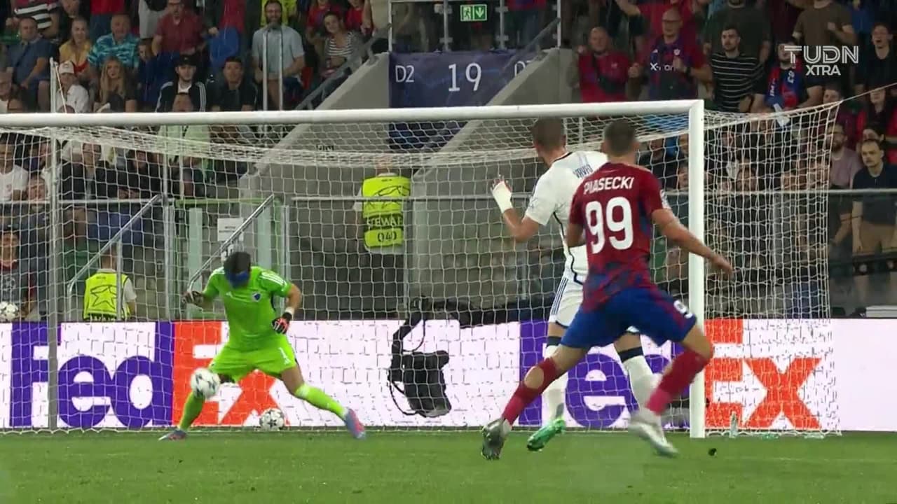 Tiro atajado. Fabian Piasecki (Raków Czestochowa) Disparo con la derecha desde fuera del área.