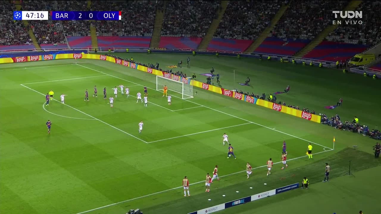 Tiro atajado por abajo a la izquierda. Fermín López (FC Barcelona) disparo de cabeza desde el centro del área. Asistencia de Lamine Yamal con un centro al área.