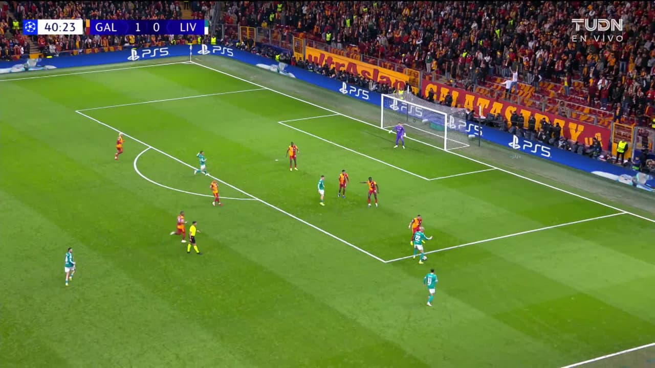 Tiro atajado. Florian Wirtz (Liverpool) disparo de cabeza desde el centro del área.