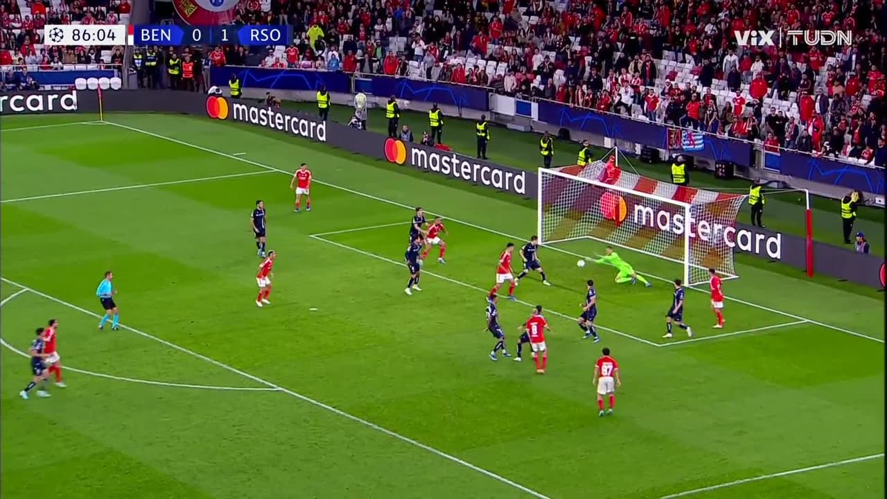 Tiro atajado por abajo a la izquierda. Fredrik Aursnes (Benfica) Disparo con la derecha desde el lado derecho dentro del área.