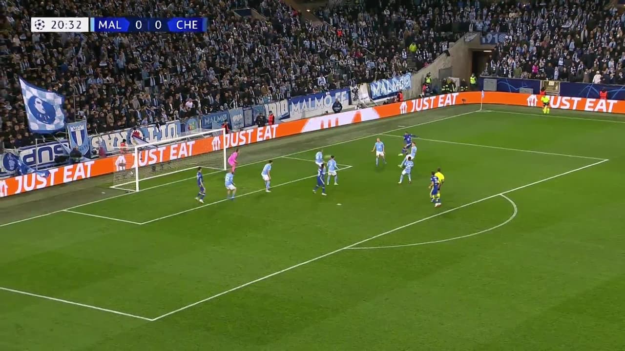 Tiro atajado raso al centro del arco. Hakim Ziyech (Chelsea) zurdazo desde el lado derecho dentro del área.