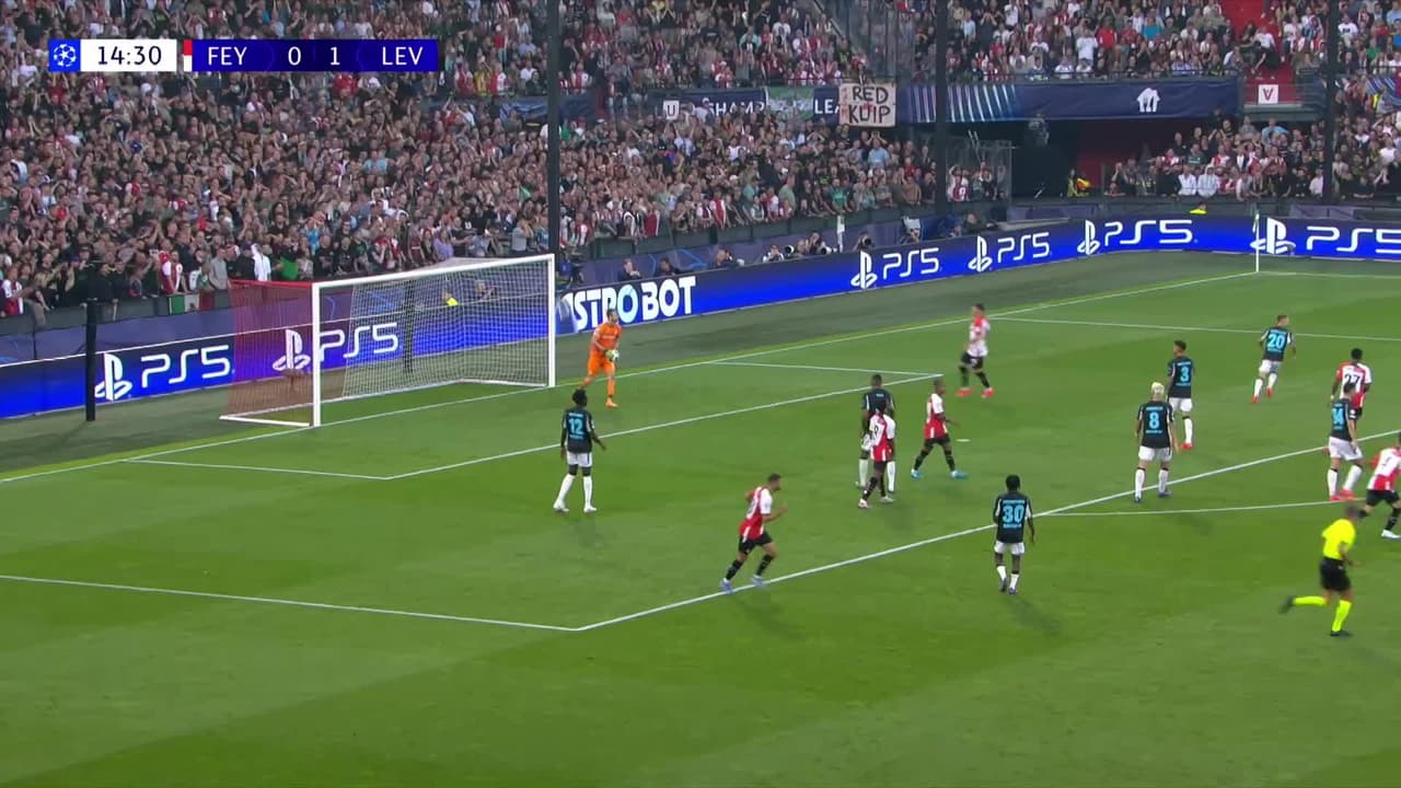 Tiro atajado al ángulo superior derecho. Hwang In-Beom (Feyenoord) Disparo con la derecha desde fuera del área.