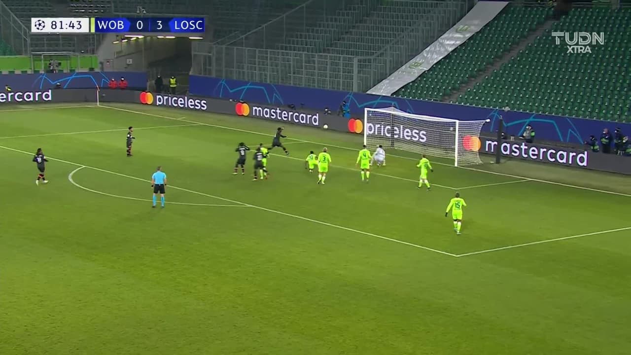 Tiro atajado. Jonathan Ikoné (Lille) Disparo con la derecha desde el lado derecho dentro del área.