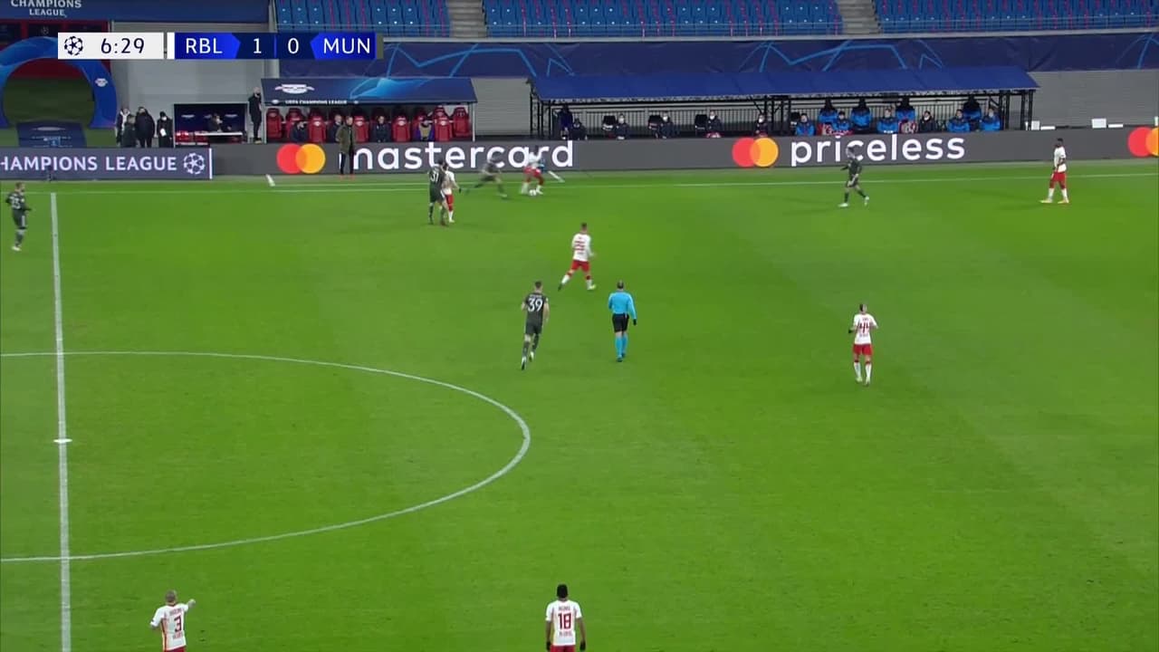 Tiro atajado. Angeliño (RB Leipzig) zurdazo desde el lado izquierdo dentro del área.