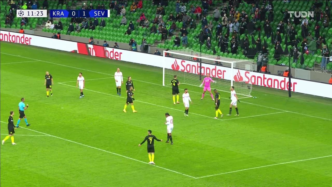 Tiro atajado junto al lado derecho de la portería. Jules Koundé (Sevilla) zurdazo desde el lado derecho dentro del área. Asistencia de Lucas Ocampos.