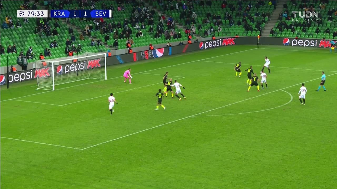 Tiro atajado raso al centro del arco. Jules Koundé (Sevilla) Disparo con la derecha desde el lado derecho dentro del área. Asistencia de Munir El Haddadi.
