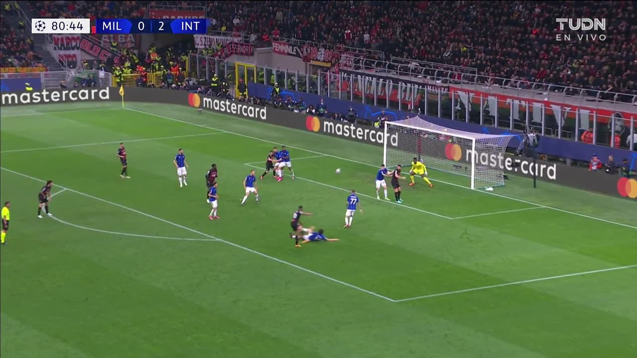 Tiro atajado. Junior Messias (Milan) Disparo con la derecha desde el lado derecho dentro del área.