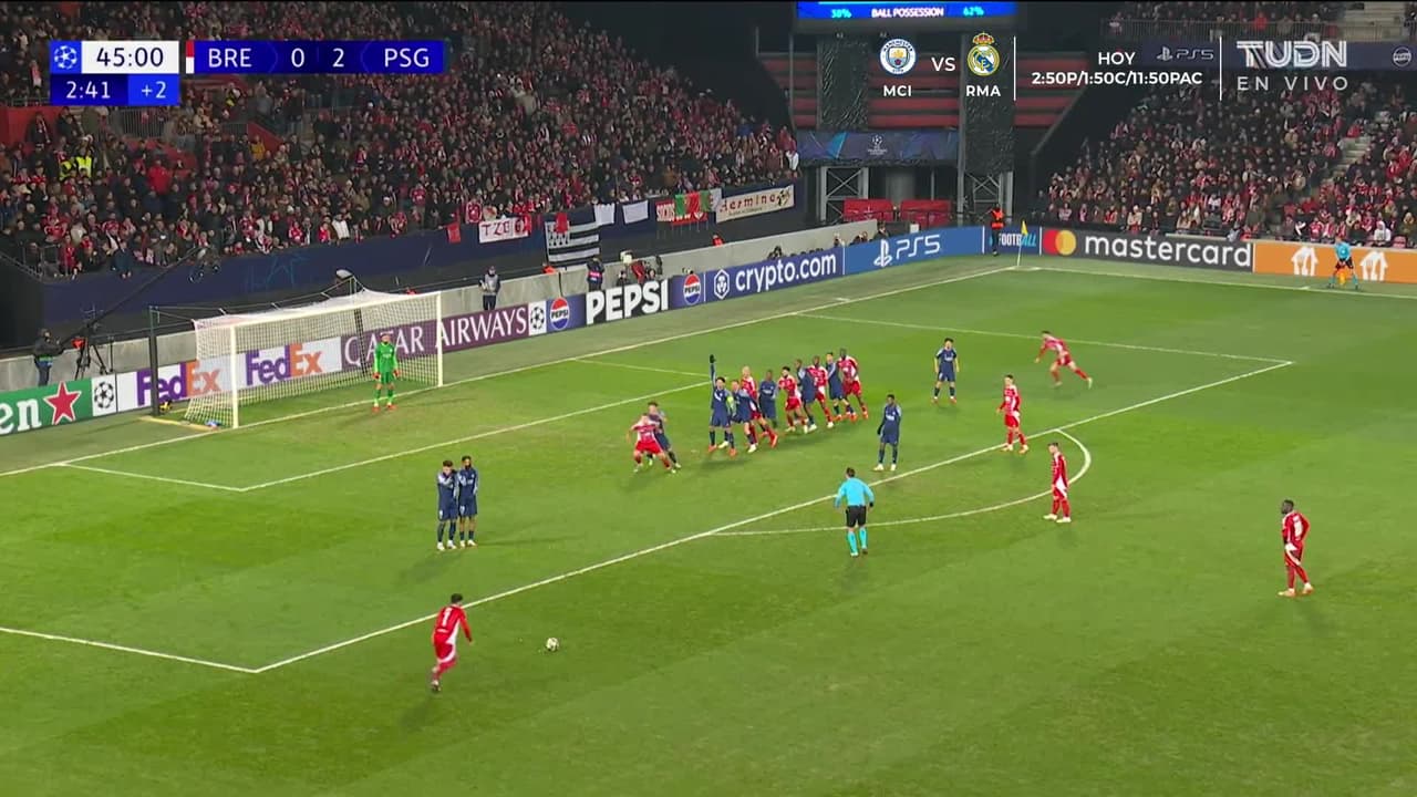 Tiro atajado por abajo a la izquierda. Kenny Lala (Brest) Disparo con la derecha desde fuera del área.