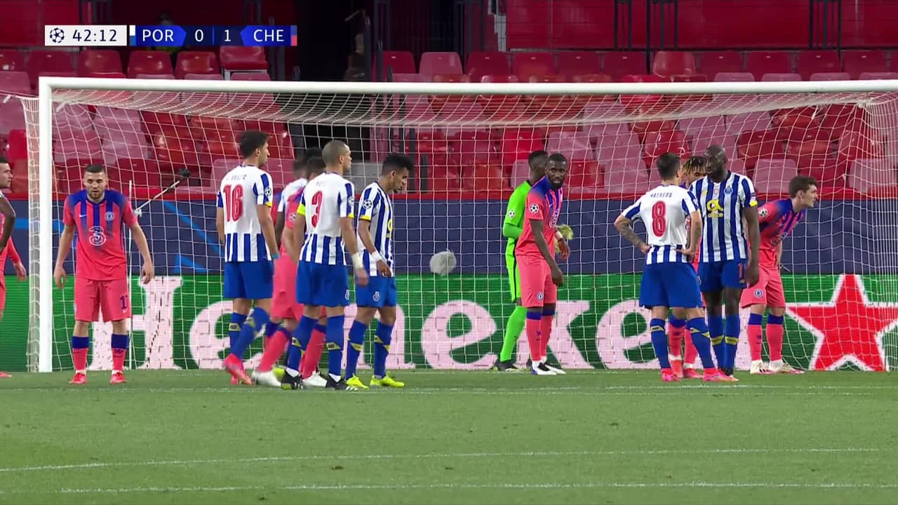 Tiro atajado junto al lado derecho de la portería. Pepe (FC Porto) disparo de cabeza desde el centro del área. Asistencia de Otávio con un centro al área.