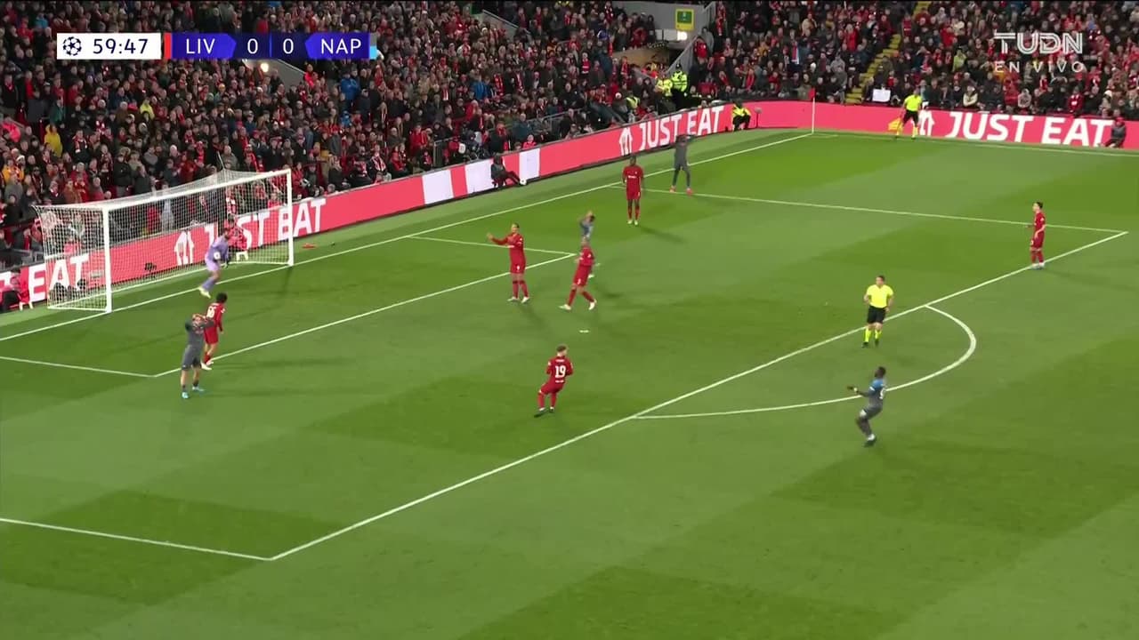 Tiro atajado raso al centro del arco. Khvicha Kvaratskhelia (Napoli) zurdazo desde el centro del área. Asistencia de Victor Osimhen con un centro al área.