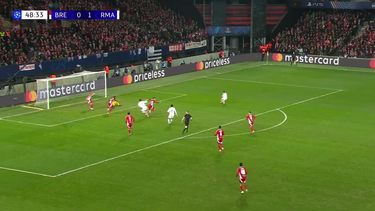 Tiro atajado. Kylian Mbappé (Real Madrid) zurdazo desde el lado izquierdo dentro del área.