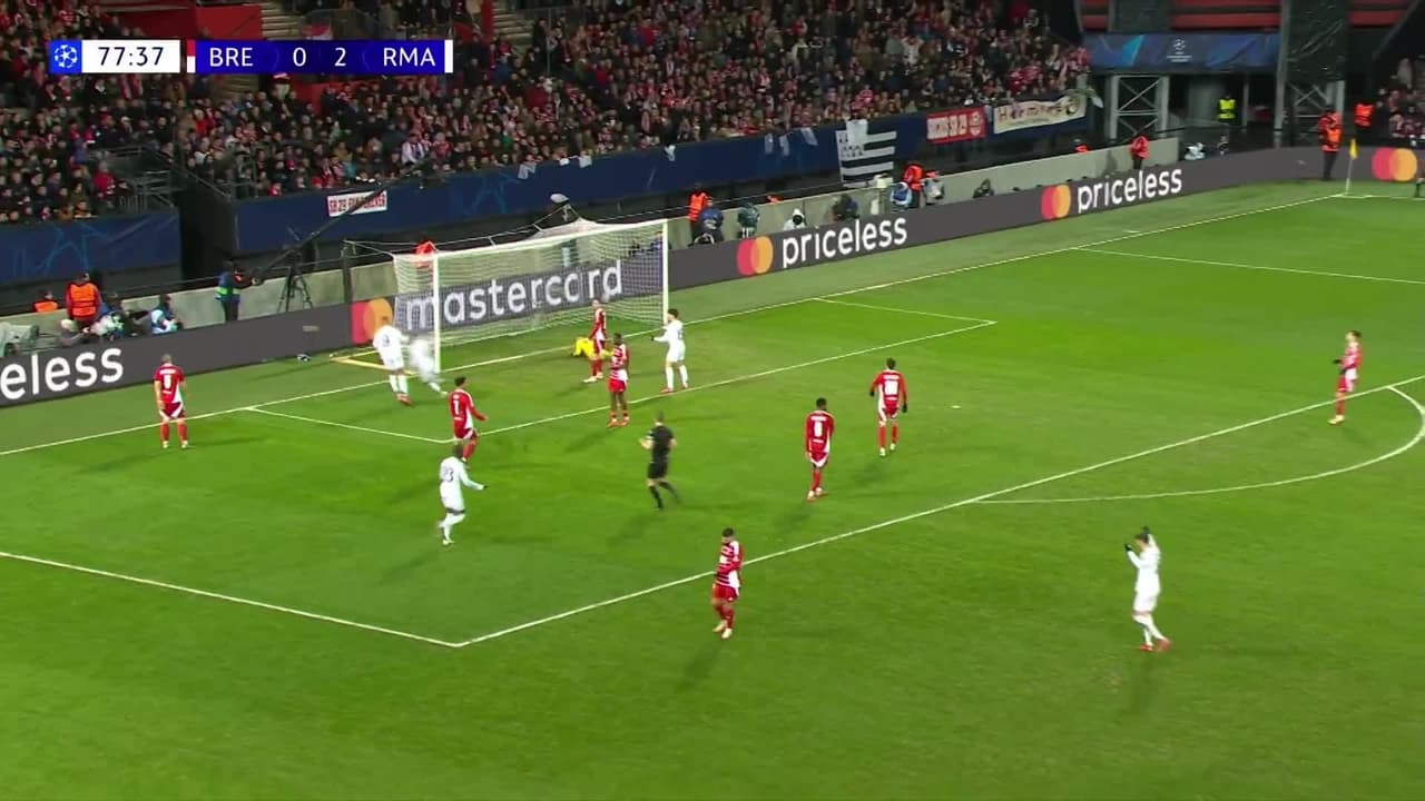Tiro atajado. Kylian Mbappé (Real Madrid) Disparo con la derecha sin ángulo desde la izquierda.