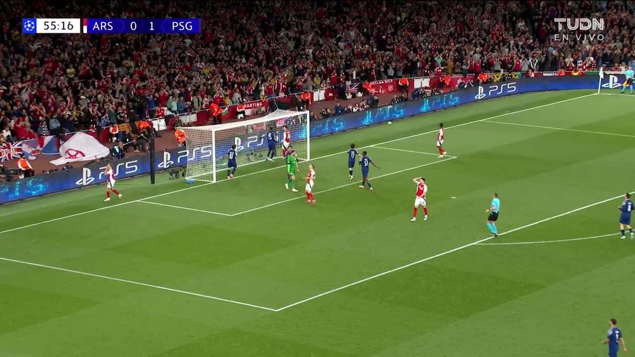 Tiro atajado raso al centro del arco. Leandro Trossard (Arsenal) zurdazo desde el lado izquierdo dentro del área. Asistencia de Declan Rice.
