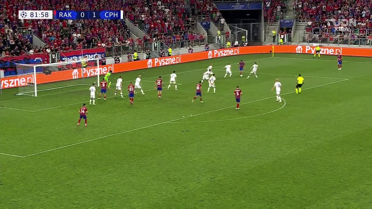 Tiro atajado por abajo a la izquierda. Lukasz Zwolinski (Raków Czestochowa) Disparo con la derecha desde el centro del área. Asistencia de Gustav Berggren.