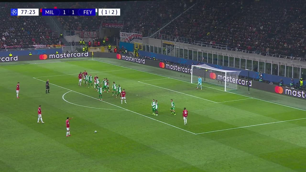 Tiro atajado por abajo a la izquierda. Malick Thiaw (Milan) disparo de cabeza a quemarropa desde el lado izquierdo. Asistencia de Tijjani Reijnders con un centro al área.
