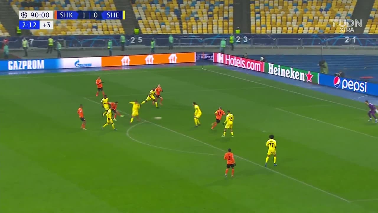 Tiro atajado por abajo a la izquierda. Manor Solomon (Shakhtar Donetsk) Disparo con la derecha desde fuera del área.