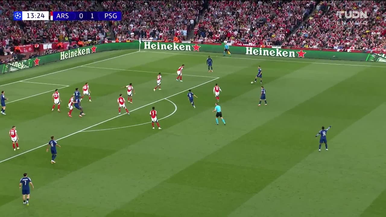 Tiro atajado Por arriba en el centro del arco. Marquinhos (Paris Saint-Germain) disparo de cabeza desde el centro del área. Asistencia de Achraf Hakimi con un centro al área.