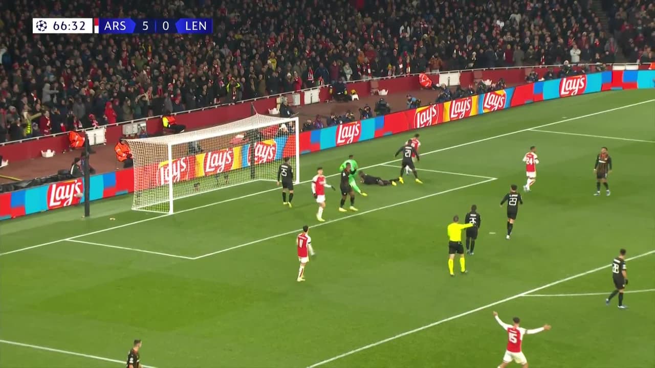 Tiro atajado. Martin Ødegaard (Arsenal) zurdazo desde el centro del área.