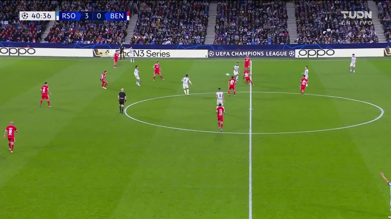 Tiro atajado. Mikel Oyarzabal (Real Sociedad) zurdazo desde el lado derecho dentro del área.