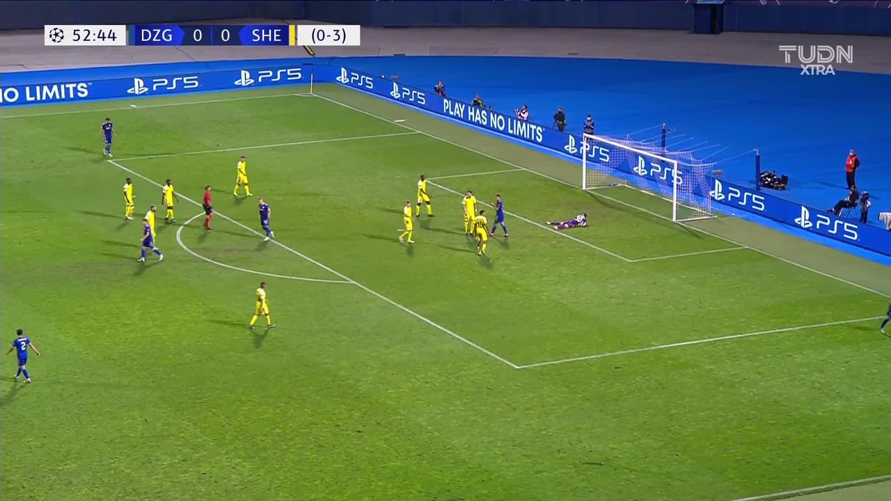 Tiro atajado al ángulo superior derecho. Mislav Orsic (Dinamo Zagreb) Disparo con la derecha desde fuera del área. Asistencia de Bartol Franjic.