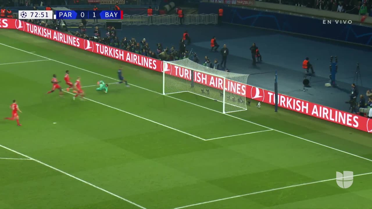 Tiro atajado raso al centro del arco. Neymar (Paris Saint-Germain) zurdazo desde el centro del área.