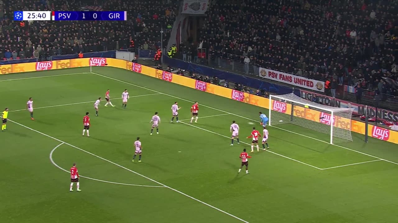 Tiro atajado. Noa Lang (PSV Eindhoven) Disparo con la derecha desde el lado izquierdo dentro del área.