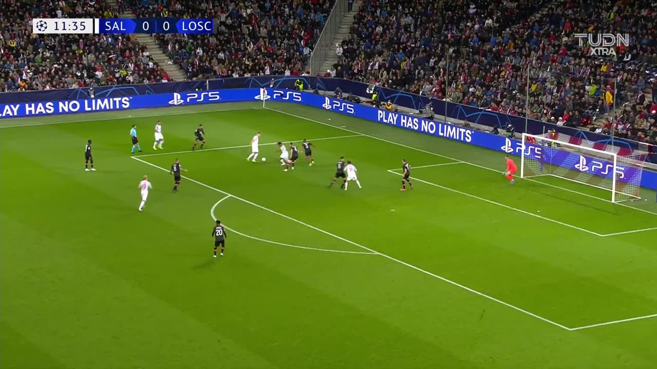 Tiro atajado raso al centro del arco. Noah Okafor (FC Red Bull Salzburg) Disparo con la derecha desde el lado izquierdo dentro del área. Asistencia de Luka Sucic.