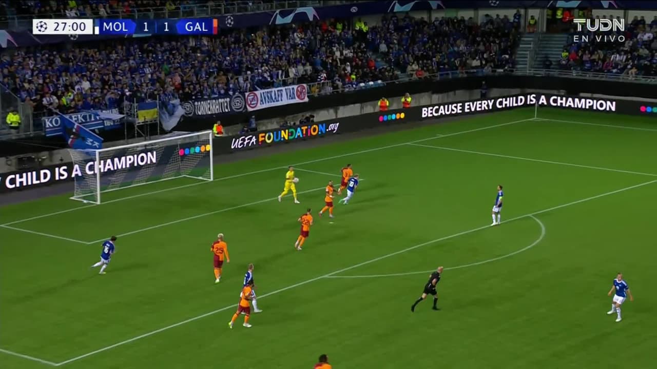 Tiro atajado. Ola Brynhildsen (Molde) Disparo con la derecha desde fuera del área.