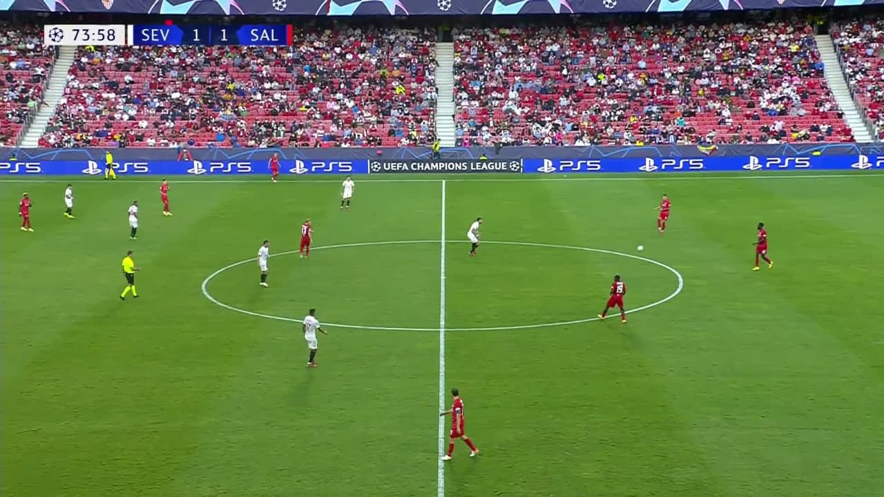 Tiro atajado raso al centro del arco. Rafa Mir (Sevilla) disparo de cabeza desde el centro del área. Asistencia de Erik Lamela con un centro al área.