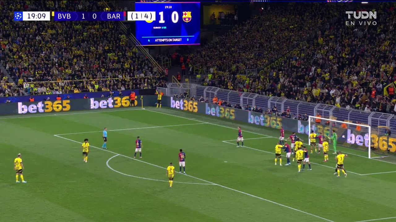 Tiro atajado junto al lado derecho de la portería. Ramy Bensebaini (Borussia Dortmund) disparo de cabeza desde el centro del área. Asistencia de Pascal Groß con un centro al área.