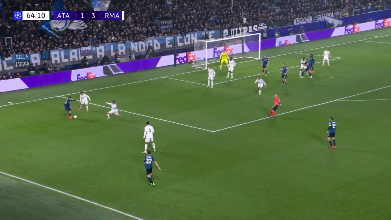 Tiro atajado. Raoul Bellanova (Atalanta) Disparo con la derecha desde fuera del área.