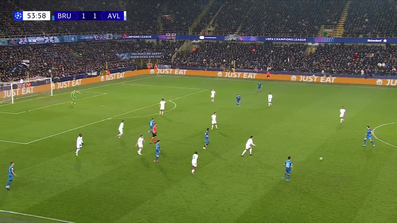 Tiro atajado al ángulo superior derecho. Raphael Onyedika (Club Brugge) Disparo con la derecha desde fuera del área.